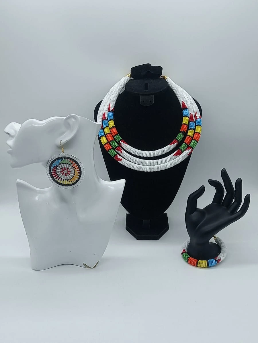 The intricate beadwork and vibrant patterns create a striking look that stands out effortlessly. Whether worn for special occasions, cultural events, photoshoots, or styled with a simple outfit, this set adds confidence and presence.